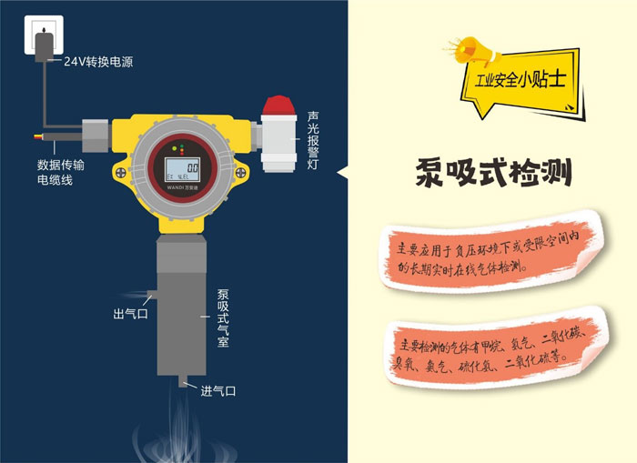 泵吸在線式氣體探測器就是在儀器氣室內內置了一個微型吸氣泵,通過儀表主板上電源端口啟動氣泵對采樣點區域的氣體進行抽氣采樣,然后將采樣氣體送入到氣室內部氣體傳感器進行分析檢測。
