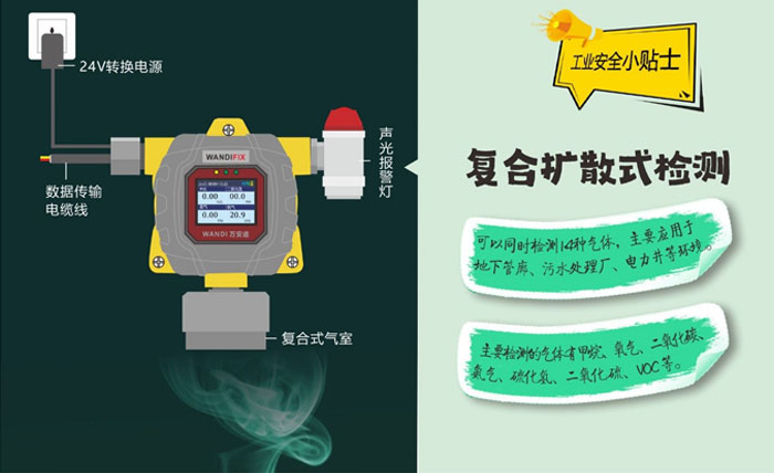 擴散在線式氣體探測器能夠實時的檢查空氣中是否含有一種或多種可燃及有毒有害氣體,一般使用于開放場合,如敞開的作業車間,檢測空氣中泄露的氣體。這種方法受檢測環境的影響,如環境溫濕度、風速風向等,監測數據會存在一定的誤差。