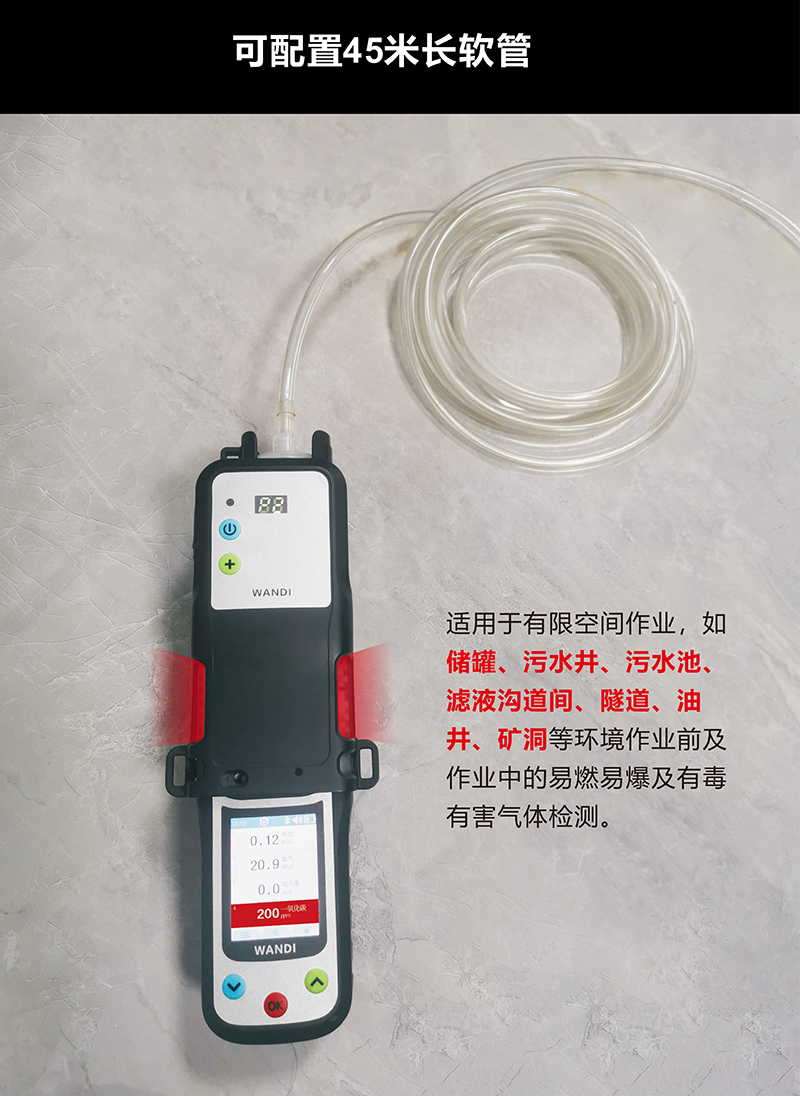 選擇EDW500便攜式氣體探測器,適用于個(gè)人安全防護(hù)、巡檢作業(yè)、區(qū)域監(jiān)測、有限空間作業(yè)以及在油井、礦洞、通道或罐體內(nèi)的有毒有害氣體和可燃?xì)怏w實(shí)時(shí)濃度的安全測量。 可同時(shí)測量多達(dá)5種氣體。為確保氣體探測器能夠準(zhǔn)確讀取有限空間內(nèi)的氣體濃度,作業(yè)前必須配備外置泵適配器,進(jìn)氣口可連接軟管(可根據(jù)現(xiàn)場需要確定軟管長度,最長可達(dá)45米),借助外置泵適配器,就可以輕松的從擴(kuò)散模式切換到泵吸模式,主動(dòng)抽取有限空間內(nèi)的有毒有害和可燃?xì)怏w,第一時(shí)間了解到各氣體的濃度情況,以便采取更好的安全措施。